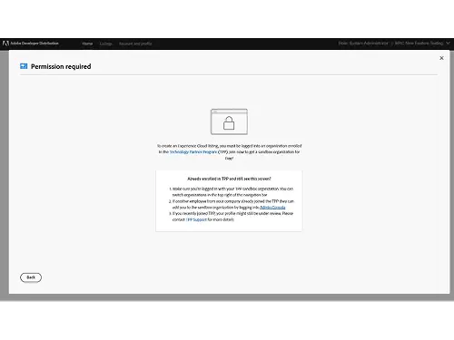 In order to create a server-to-server integration listing for Adobe products, the developer must have a sandbox Enterprise org associated with their Adobe login. All partner program members get a sandbox enterprise org assigned upon approved registration. Attempting to create an integration listing without joining the program will result in an access denied message. If you encounter this screen, check with your sandbox admin for guidance.