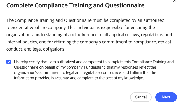 Authorized contacts for your company will see a button labeled Complete the Adobe Business Compliance Training & Questionnaire. Click the button if visible.