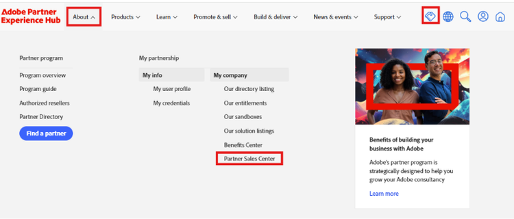 From the top navigation bar, click About → My partnership → My company → Partner Sales Center