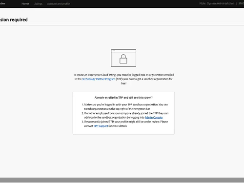 In order to create a server-to-server integration listing for Adobe products, the developer must have a sandbox Enterprise org associated with their Adobe login. All partner program members get a sandbox enterprise org assigned upon approved registration. Attempting to create an integration listing without joining the program will result in an access denied message. If you encounter this screen, check with your sandbox admin for guidance.