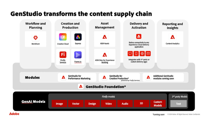 Adobe’s GenStudio solution solves today’s content supply chain demands, helping marketers seamlessly manage the entire content lifecycle—from planning and creation to activation and analytics. With centralized workflows, generative AI, and deep performance insights, GenStudio enables companies to produce more personalized content, reduce costs, and accelerate time-to-market, all while ensuring brand consistency and compliance.